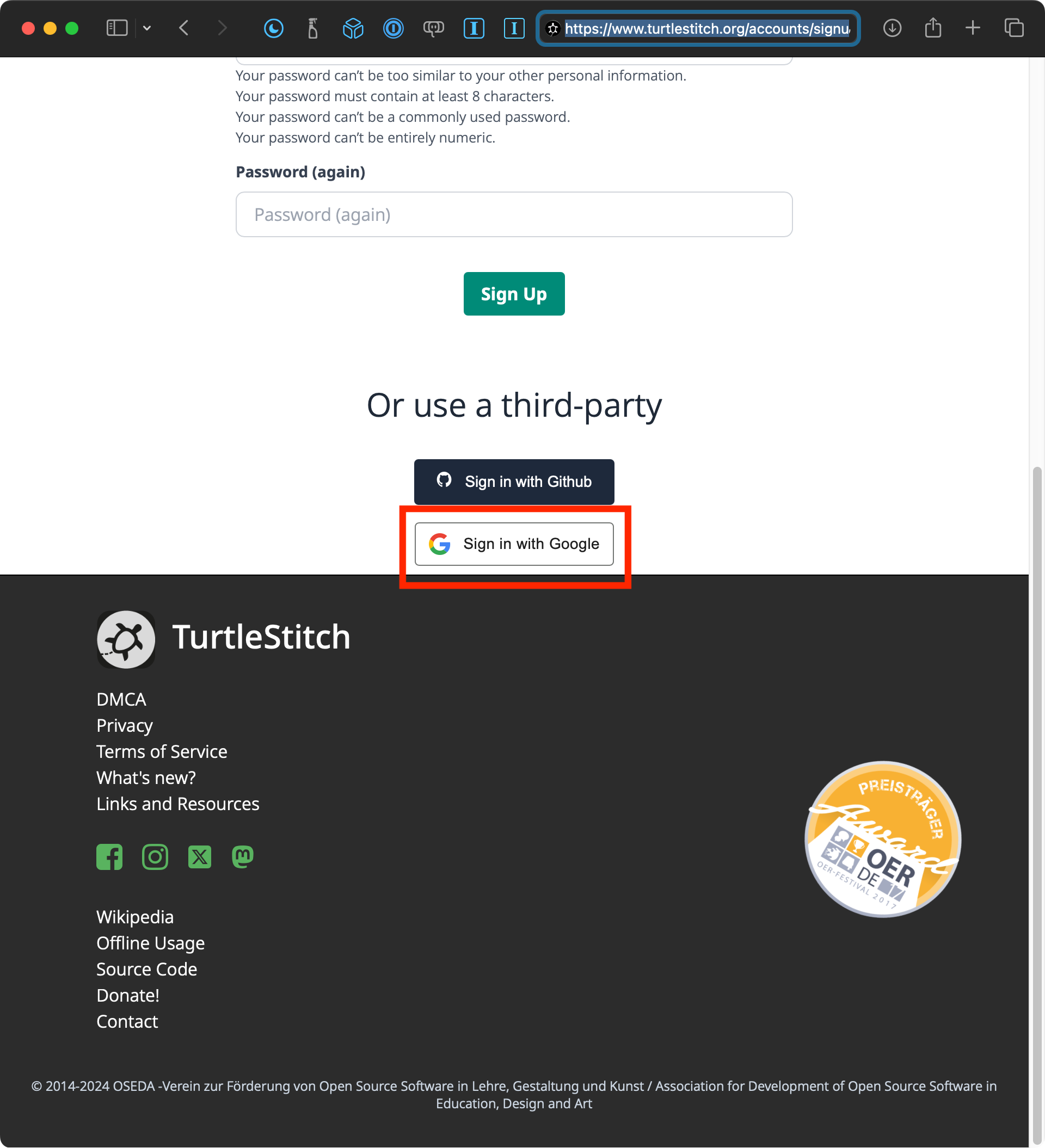 Please sign up for TurtleStitch now – scroll down and click on the Sign in with Google link: