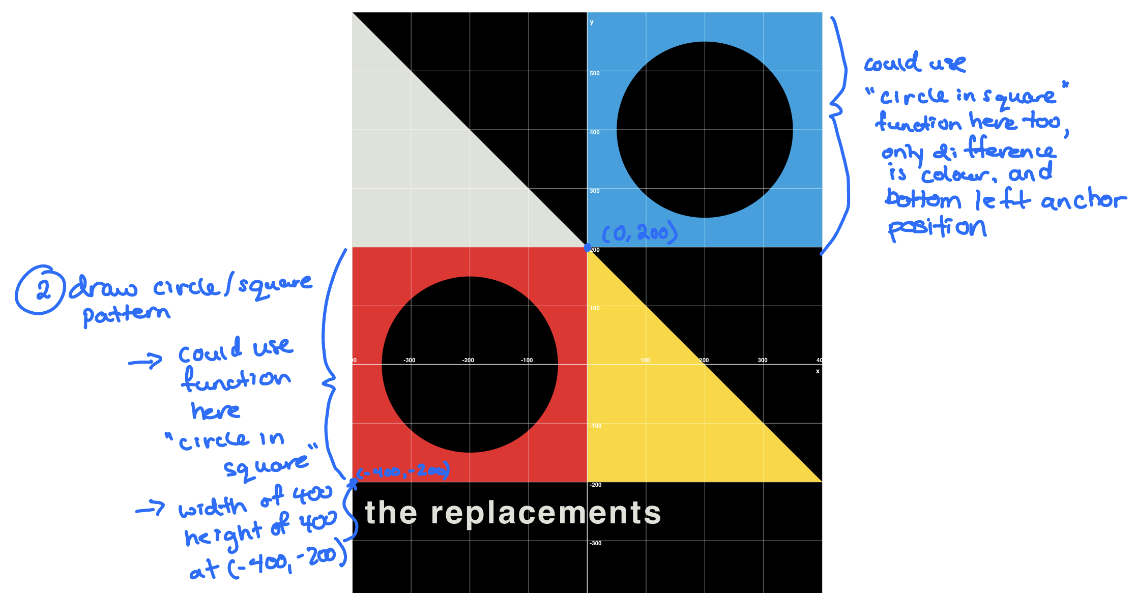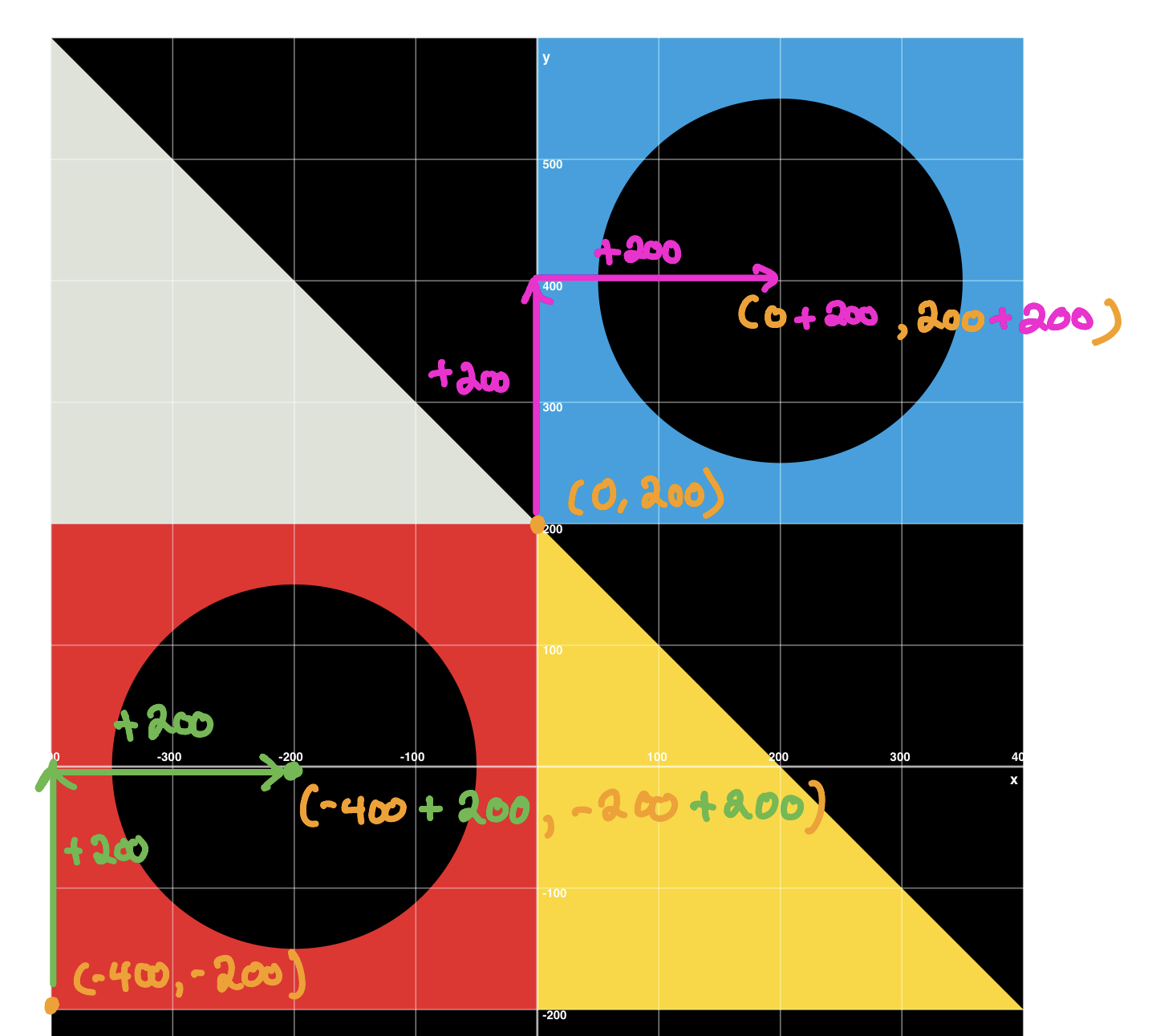Before we make the changes in code, let’s examine an even more detailed version of our plan – noting that each circle is positioned 200 pixels above and 200 pixels to the right of the anchor point: