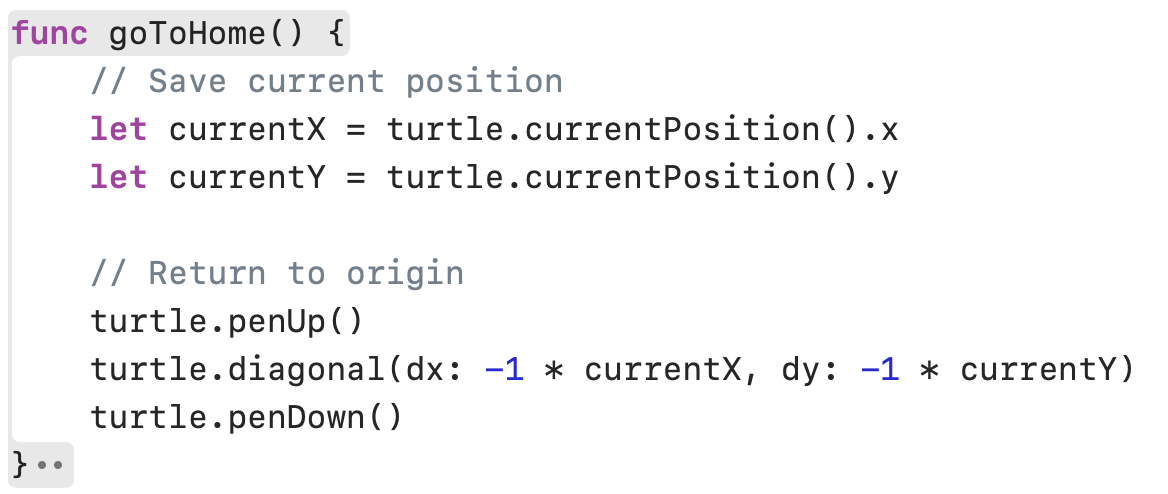 turtle.diagonal(dx: -1 * currentX, dy: -1 * currentY)