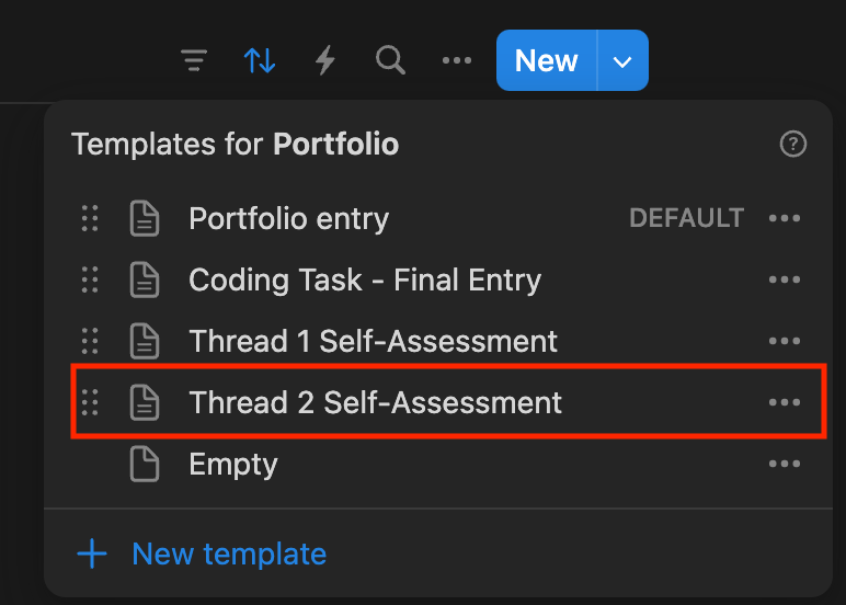 Go to Notion, click the small arrow at right beside the blue New button, then select the Thread 2 Self-Assessment option.