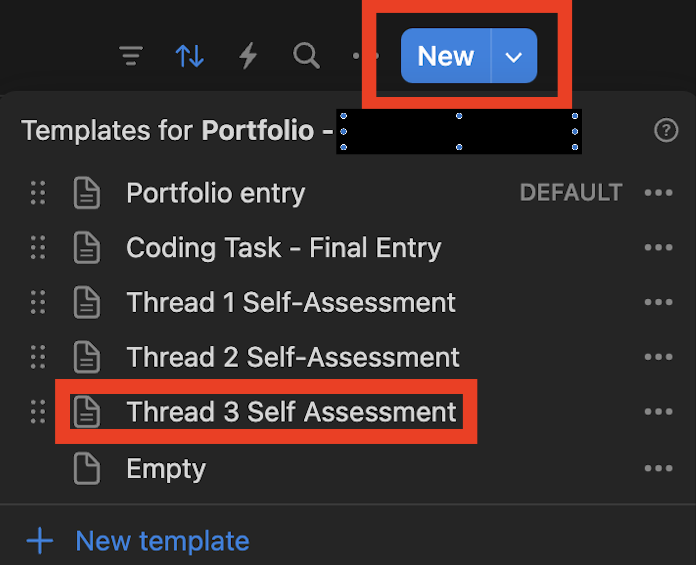 Go to Notion, click the small arrow at right beside the blue New button, then select the Thread 3 Self-Assessment option.